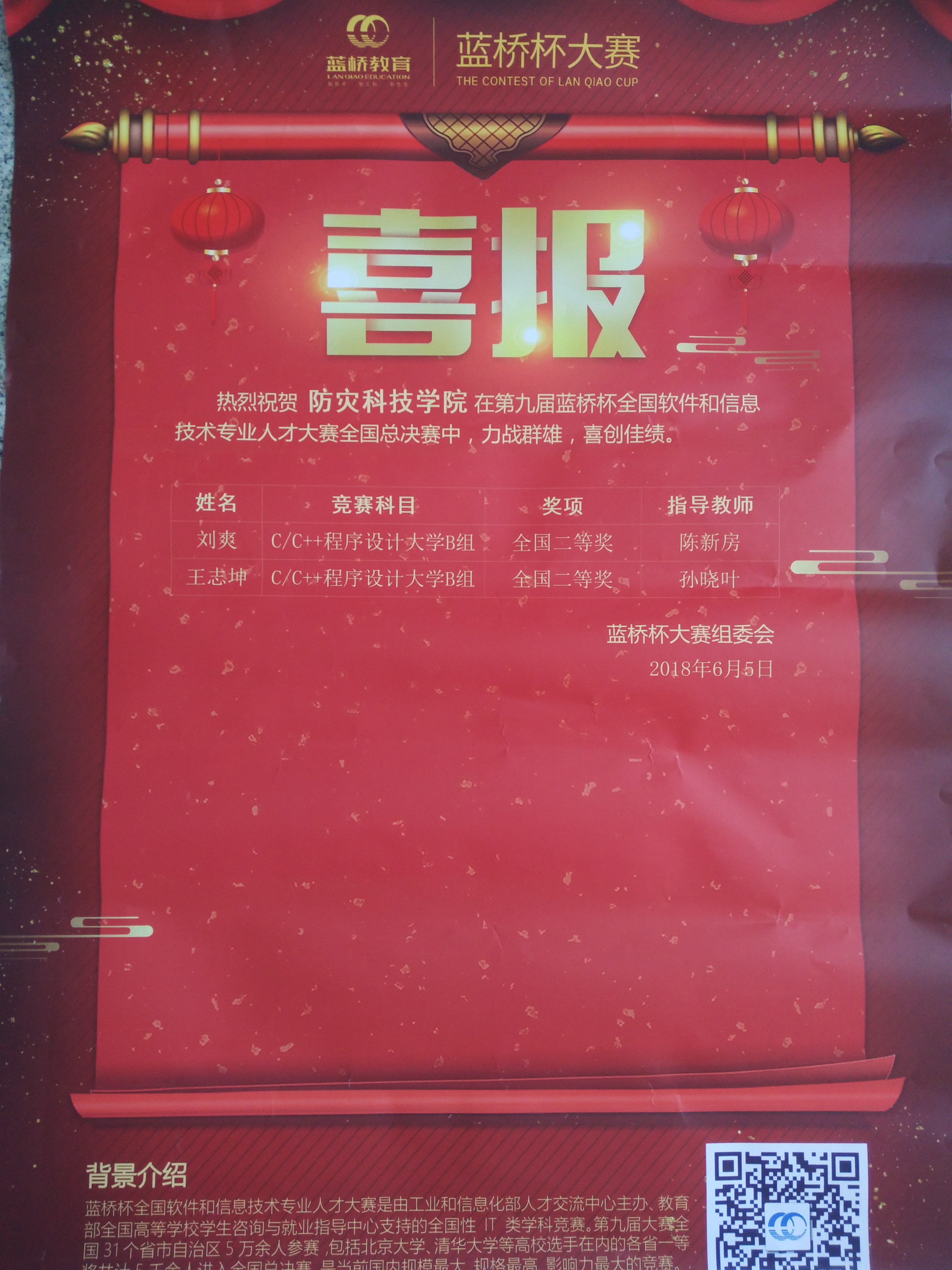 第九届“蓝桥杯”大赛由来自全国省市自治区5万员工同台竞技,包括北京大学、清华大学等高校选手在内的各省一等奖共计5千余人进入全国总决赛,是当前国内规模最大、规格最高、影响力最大的IT类竞赛。我系员工刘爽、王志坤在获得省赛一等奖的基础上,再接再厉,在总决赛中分别荣获二等奖的好成绩。