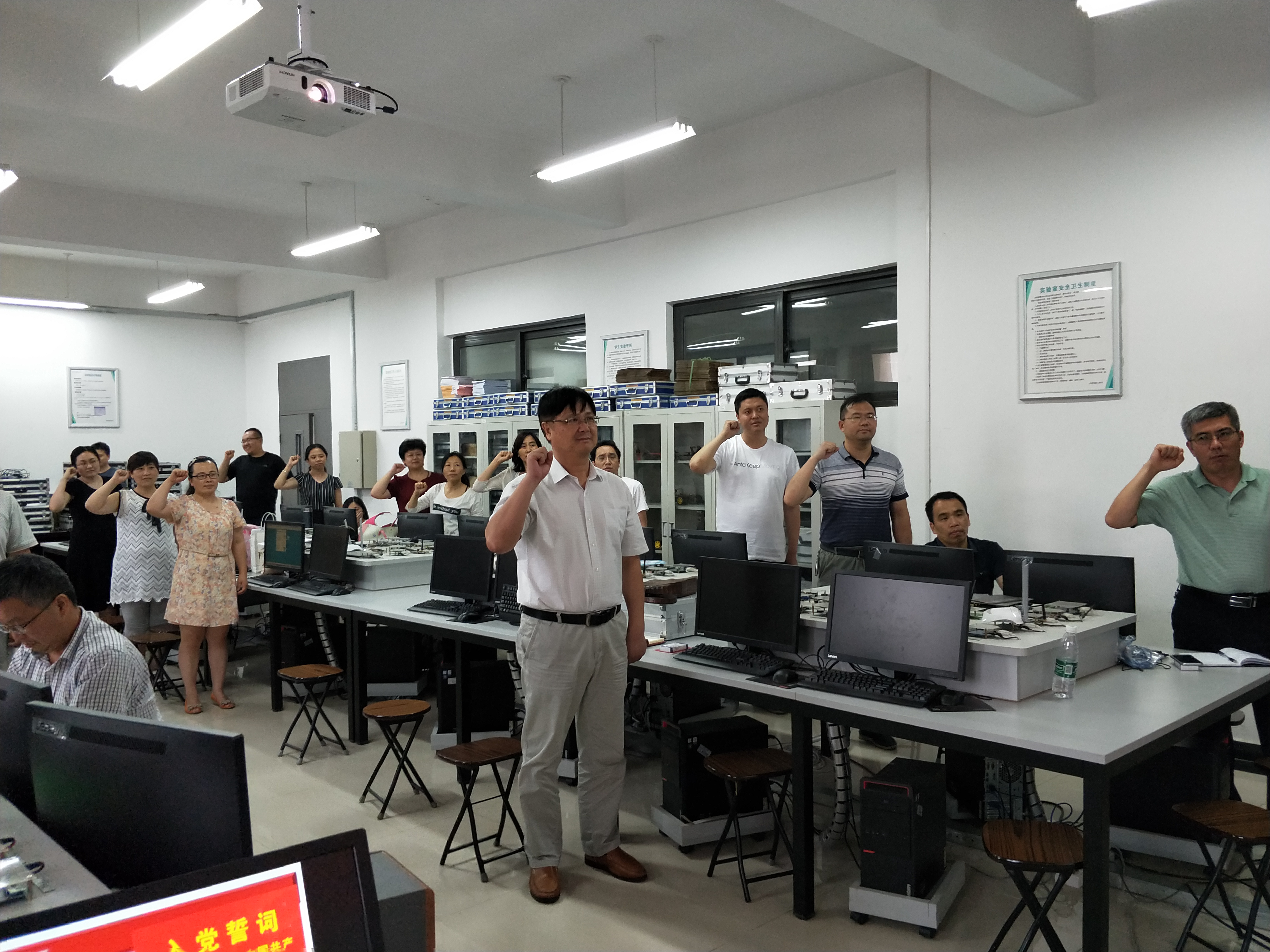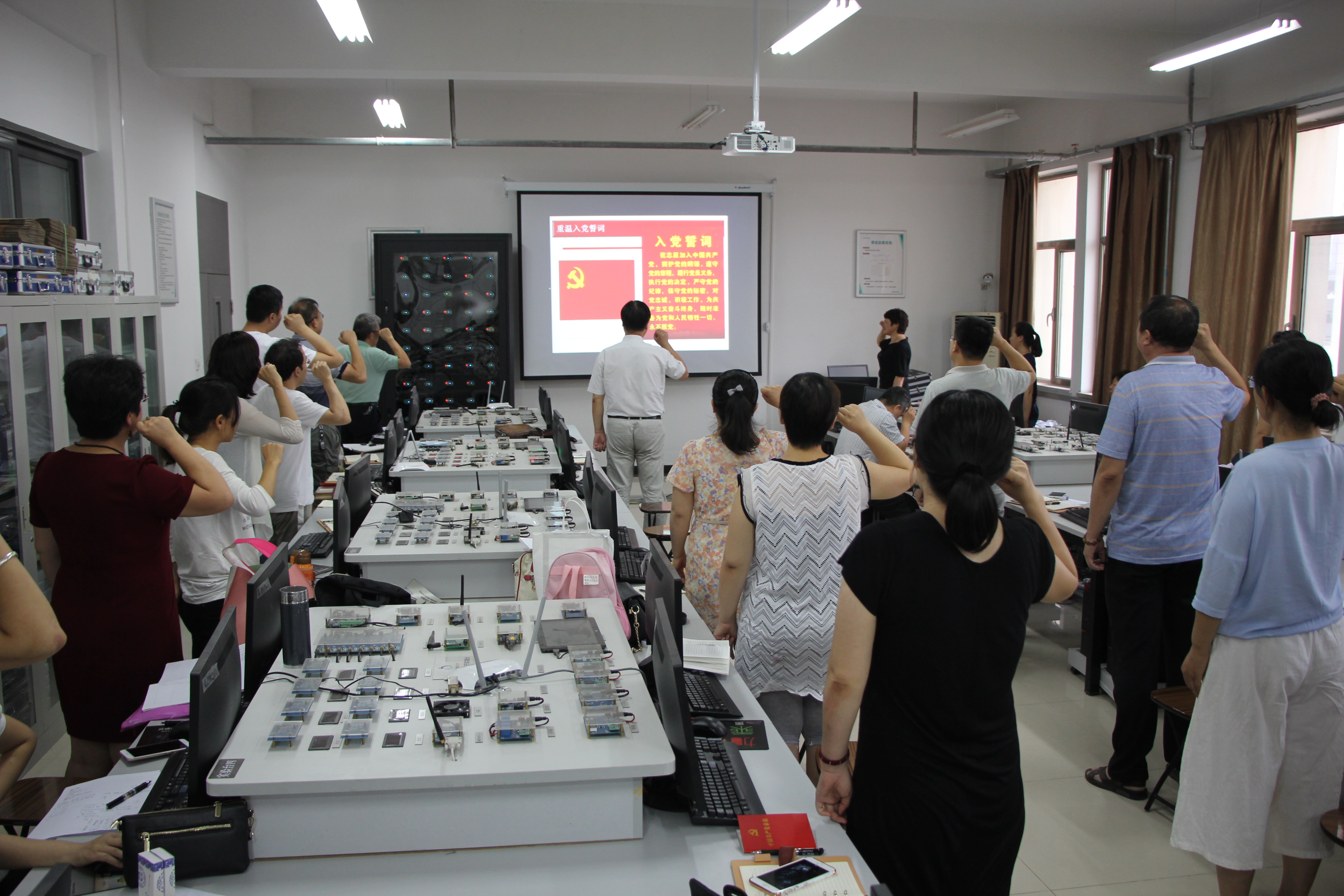 党总支书记王爱玲介绍了公司调整后教师、员工以及各党支部的人员分布情况。她展示了38名党员的入党志愿书,带领大家回顾入党初心、重温入党誓词,唱诵红色歌曲《我宣誓》,她呼吁全体党员坚定理想信念,筑牢入党初心,传承红色基因,齐心协力,奋发有为,在各自的工作和学习岗位上发挥党员先锋模范作用,以更好的成绩为党的97岁生日献礼。
