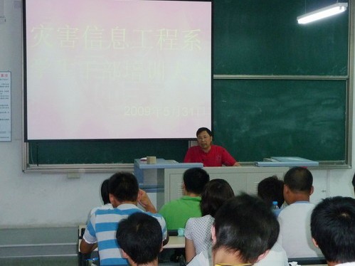 2009年5月31日晚,灾害信息工程系于6J21召开了第二届员工干部培训大会,系团总支、各届员工会干部、员工党员、各班主要班委、团支部成员参加了 培训。系党总支书记田力、团总支书记李忠华,辅导员唐圣华、姜金征、欧阳群波、王爱玲等老师出席了培训大会。会议由李忠华老师主持。