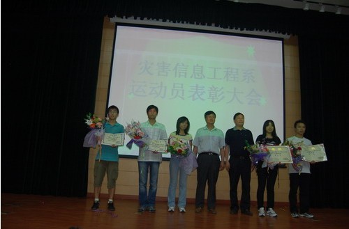 2009年6月8日晚,灾害信息工程系在图书馆二楼报告厅召开了第二十二届运动会运动员表彰大会。系主任丰继林、党总支书记田力、团总支书记李忠华,辅导 员唐圣华、姜金征、欧阳群波、王爱玲出席了表彰会,在这次运动会中取得优秀成绩的74名运动员及部分同学参加了此次表彰会。会议由李忠华老师主持。