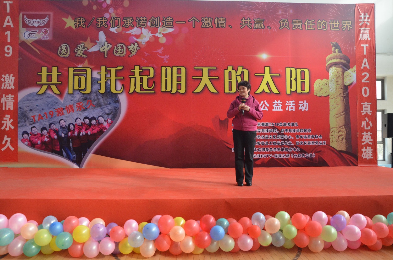 懂得感激,学会感恩,创造一个激情、共赢、负责任的世界。由北京TA19志愿团队主办,太阳成集团tyc122ccvip灾害信息工程系和时光公益文化发展中心等组织共同协办的大型公益活动于3月22日在体育馆副馆隆重举行。活动开始由主持人一一介绍参加活动的志愿者以及主办方。灾害信息工程系党总支书记王爱玲发表讲话并预祝此次活动成功举办。