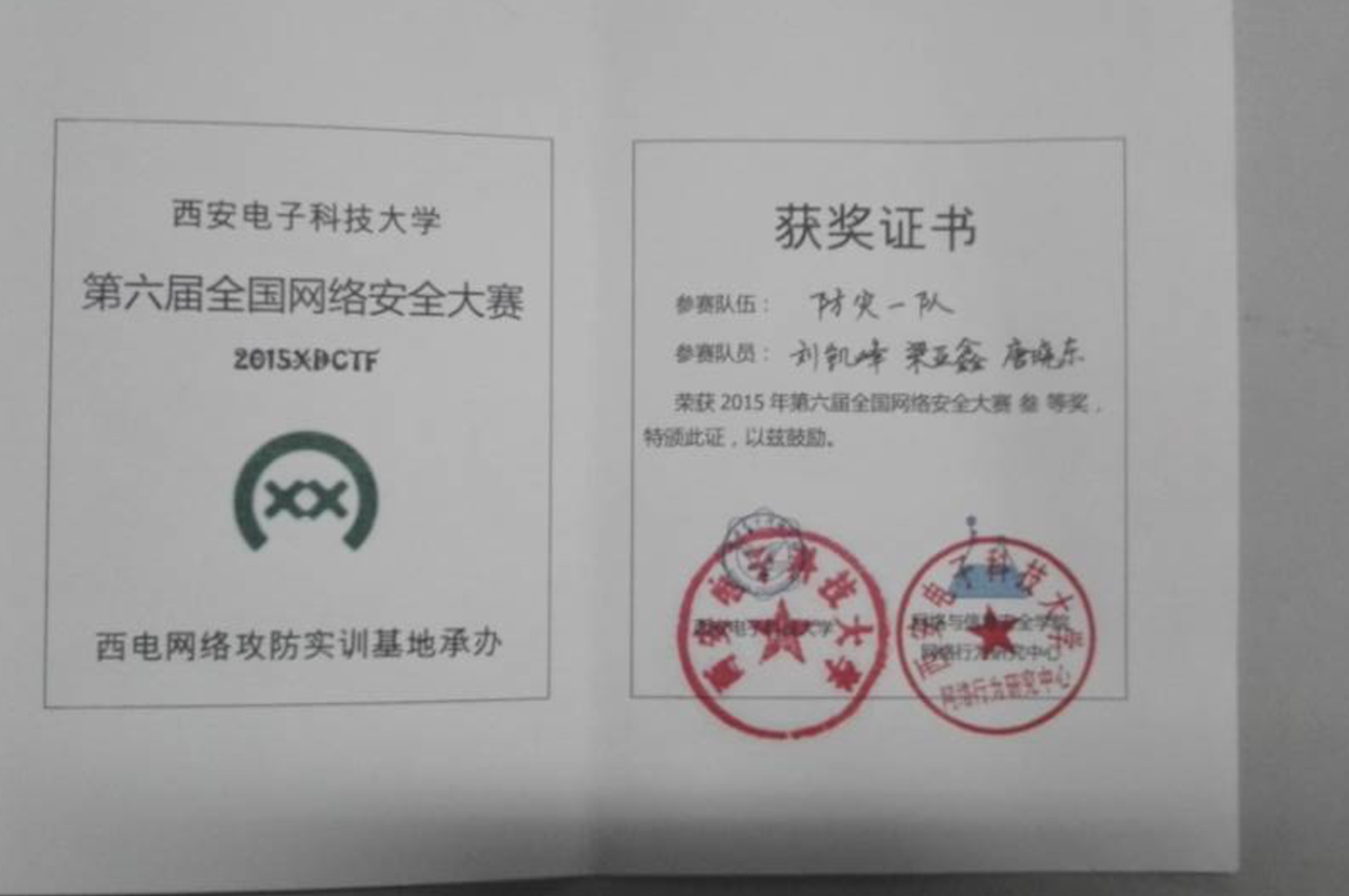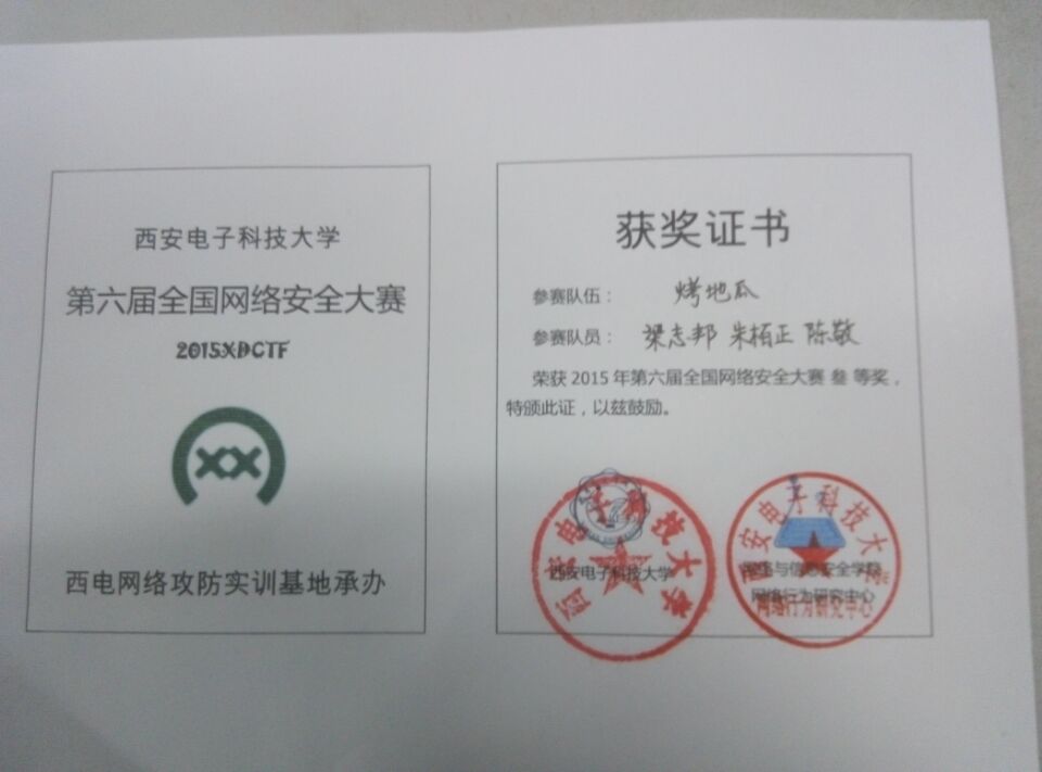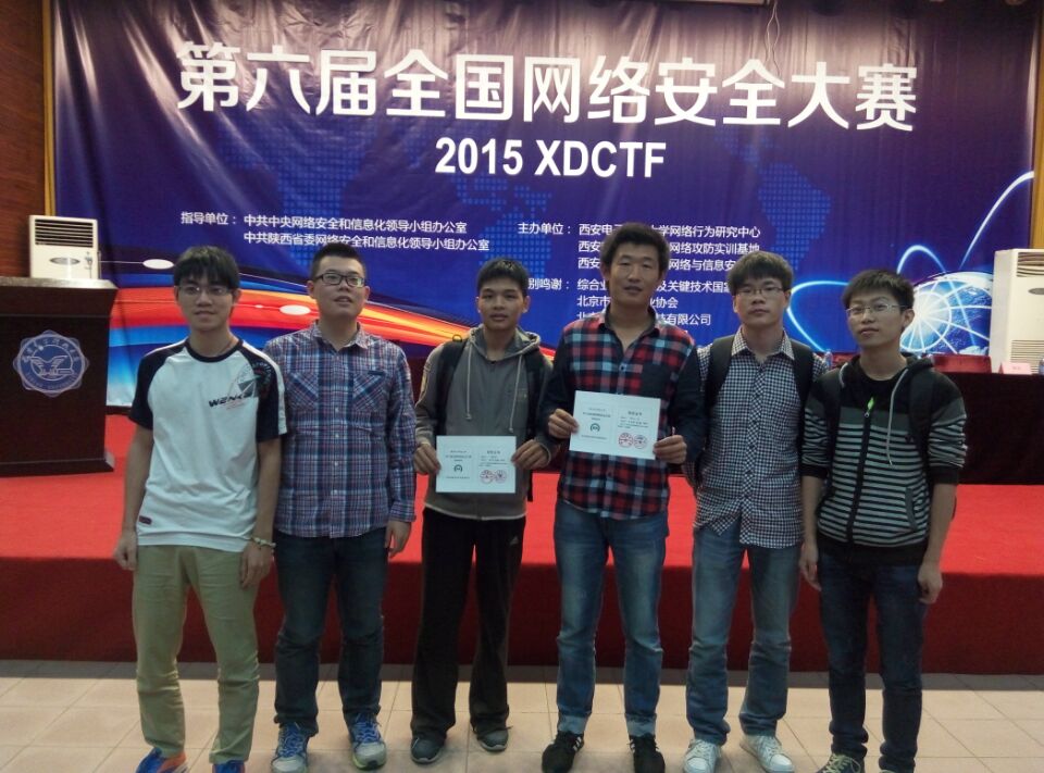 日前,公司灾害信息工程系王小英老师率领部分同学参加了在西安举办的“2015第六届全国网络安全攻防大赛总决赛”CTF比赛。此次比赛分线上和线下两个阶段进行。十月初,全国1139支高校代表队参加了线上比赛,经过激烈竞争,最终有40支队伍脱颖而出,获得参加线下比赛资格。由灾害信息工程系刘凯峰、梁亚鑫、唐晓东同学组成的“防灾一队”和梁志邦、朱栢正、陈敬同学组成的“烤地瓜队”经过初赛淘汰和激烈决赛,最终获得CTF网络攻防三等奖,分别获得证书和奖金。