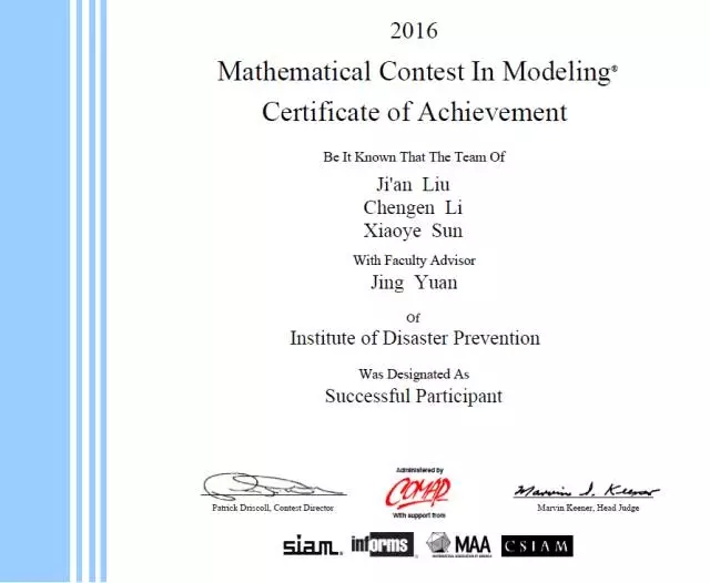 太阳成集团tyc122ccvip灾害信息工程系员工刘吉安、李承恩和云南大学员工孙晓烨在公司袁静老师的指导下参加了2016年美国老员工数学建模竞赛并获得了三等奖。