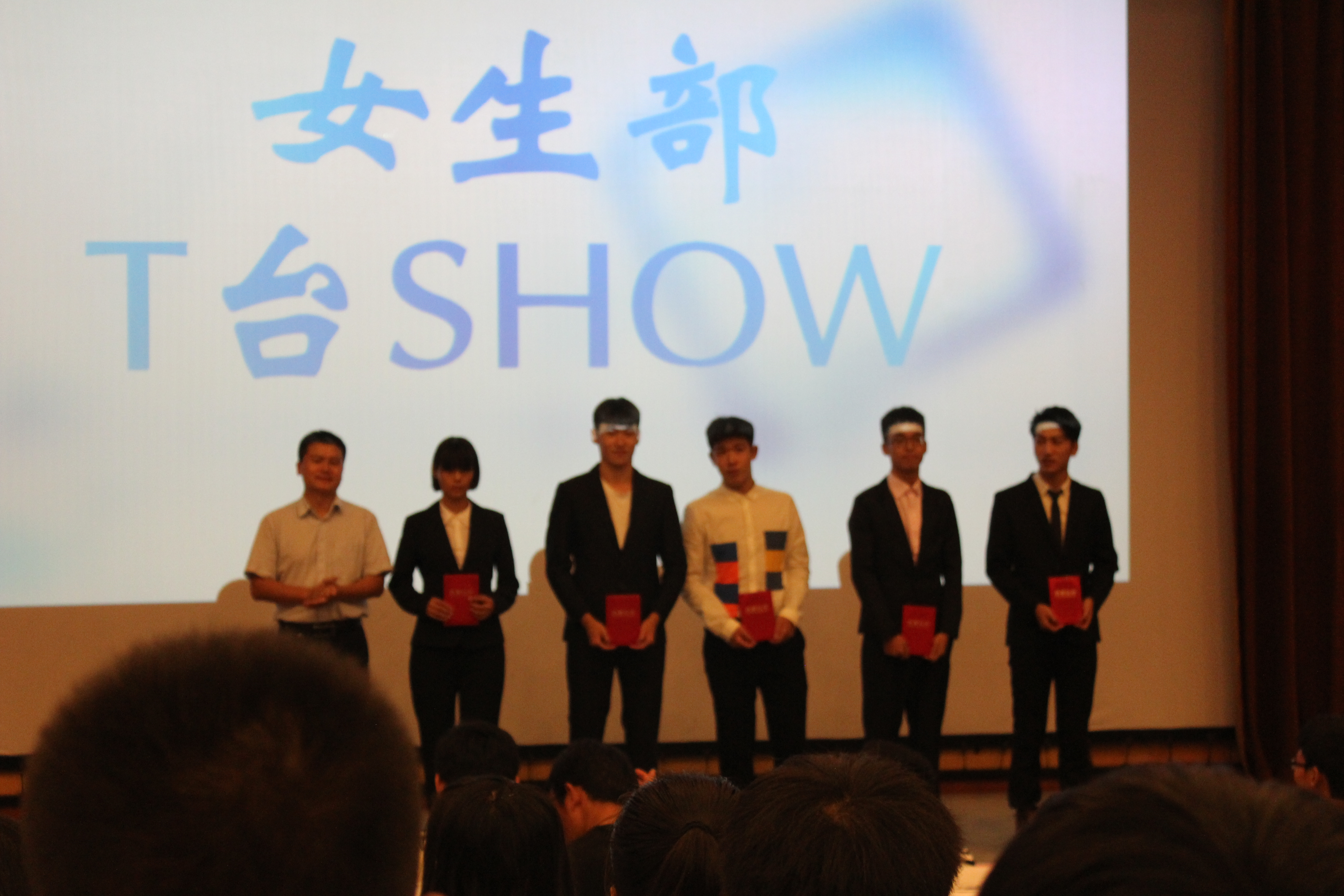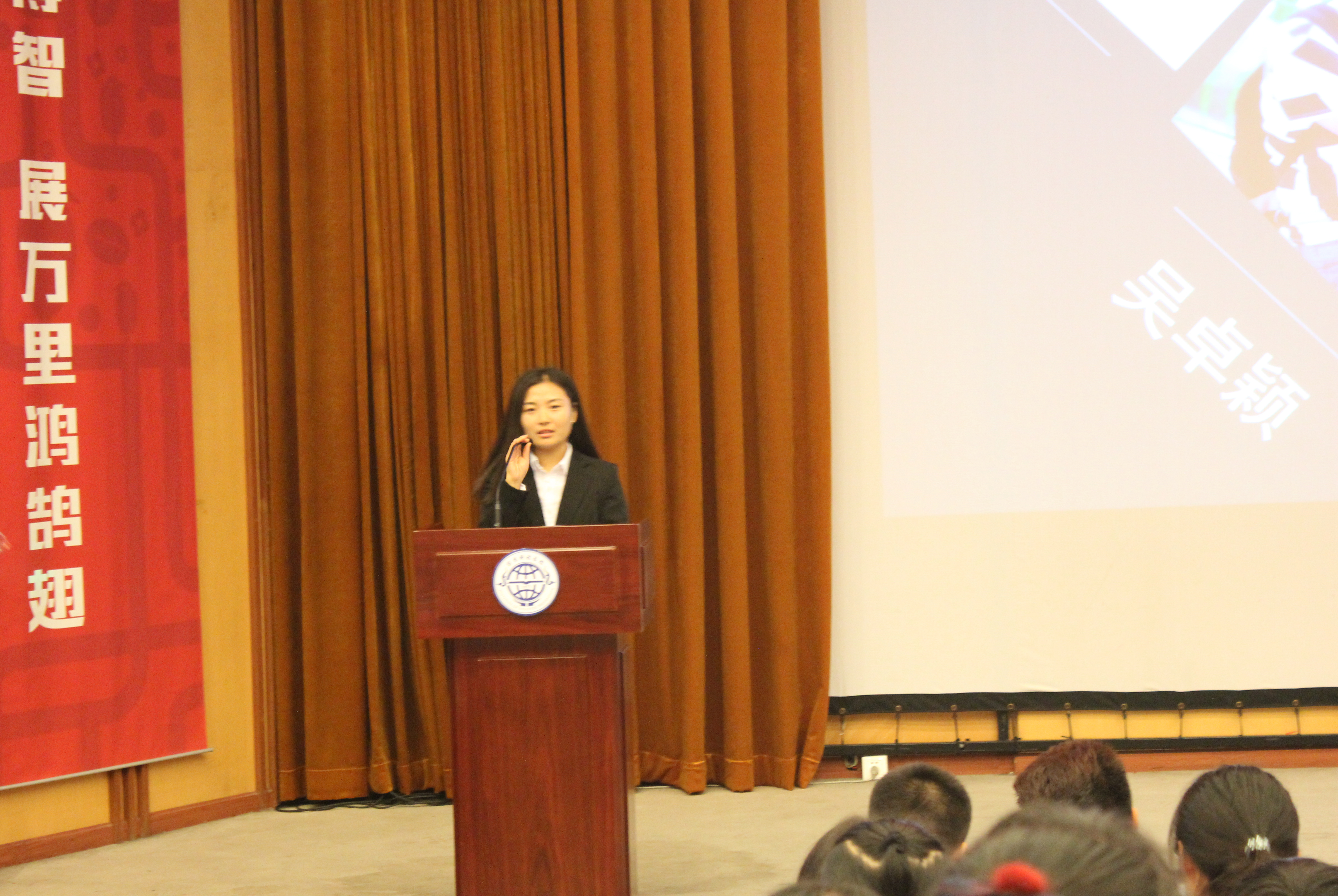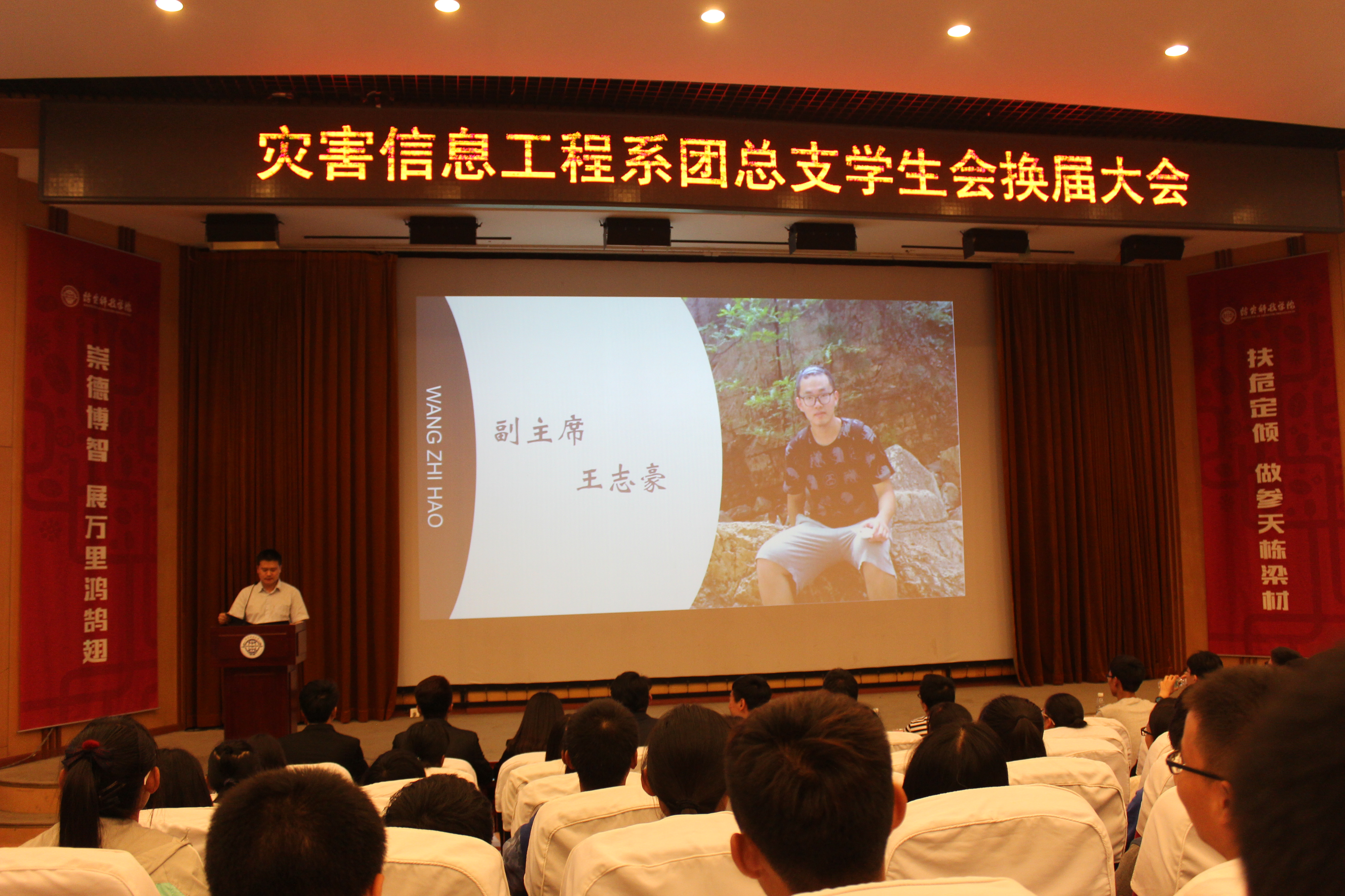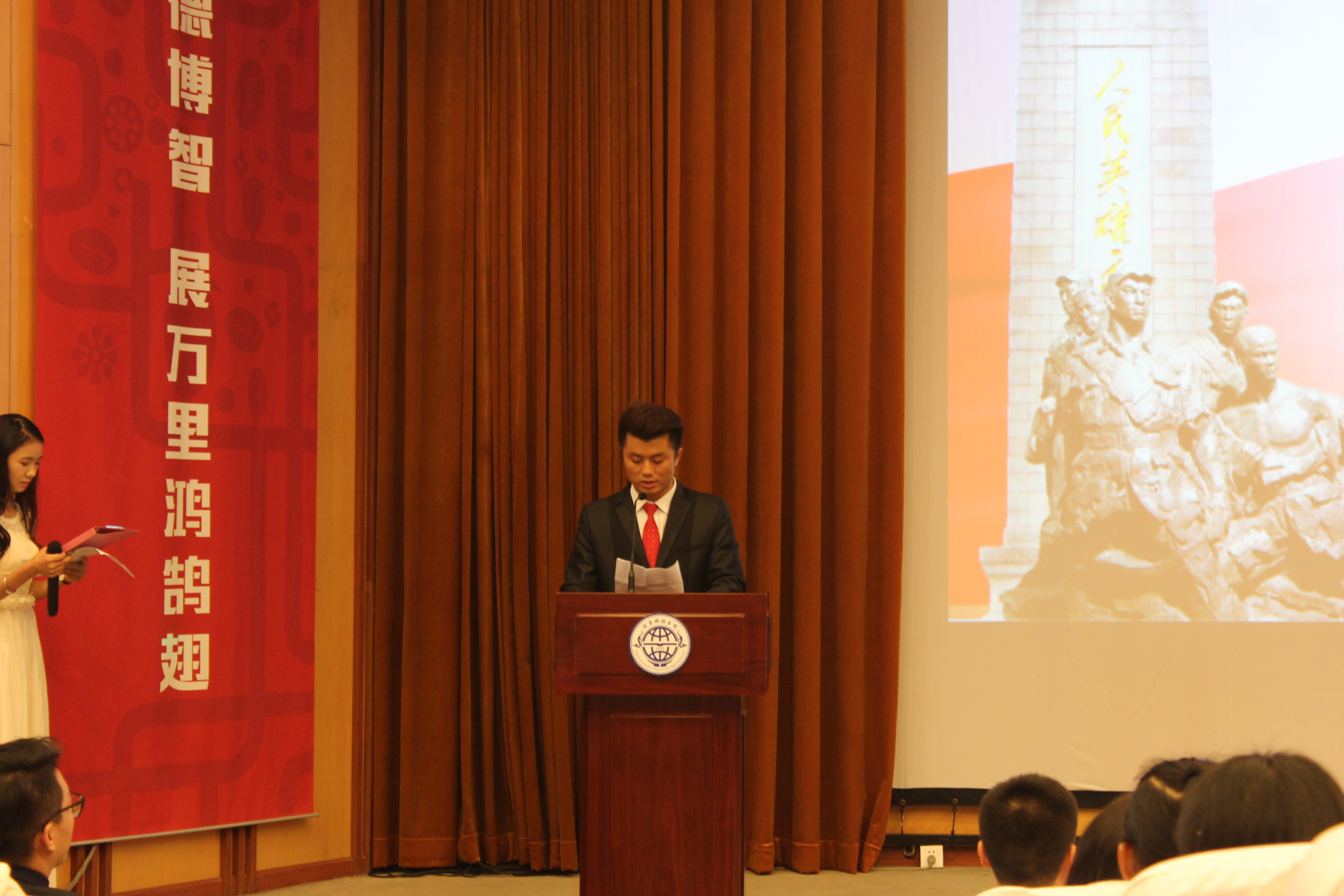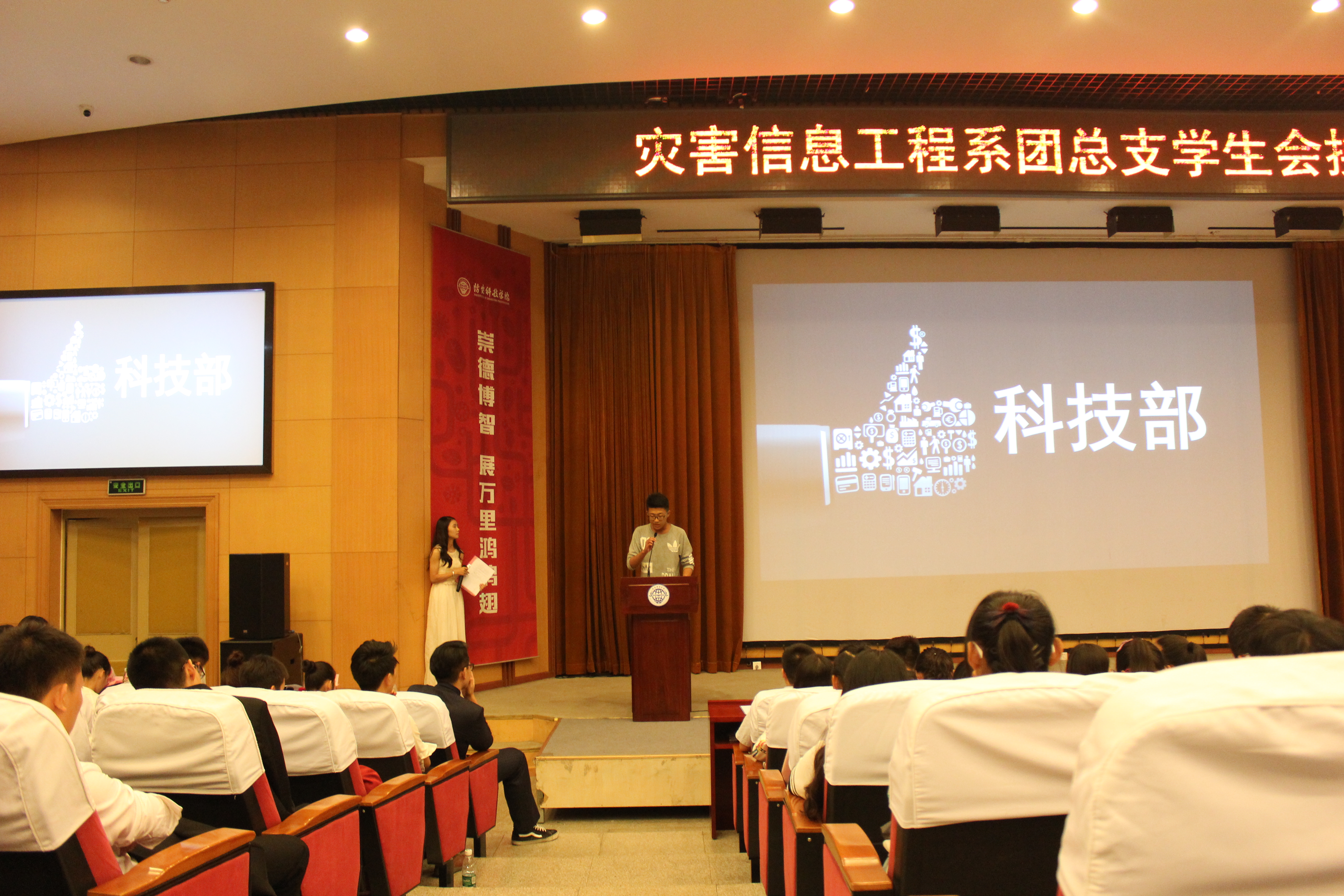 大会第一项主持人刘柳登台做开场白,介绍与会人员,后台播放共青团团歌,全体起立。