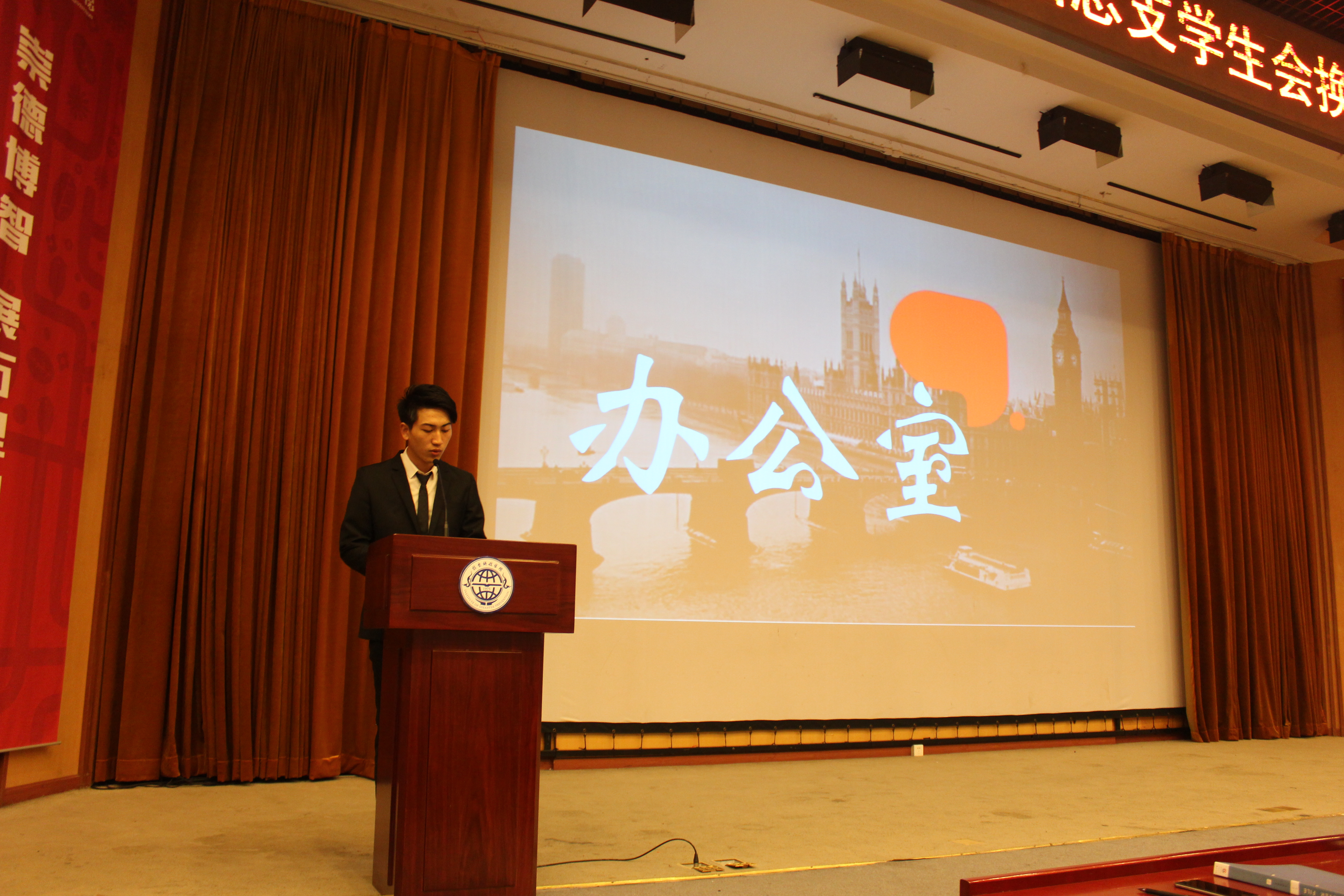 第五项,办公室王腾蛟代表新一届员工会干事发言,围绕“社会不会相信眼泪,更不会等你长大”为题提醒新一届的员工会成员要团结协作,共同为同学服务。