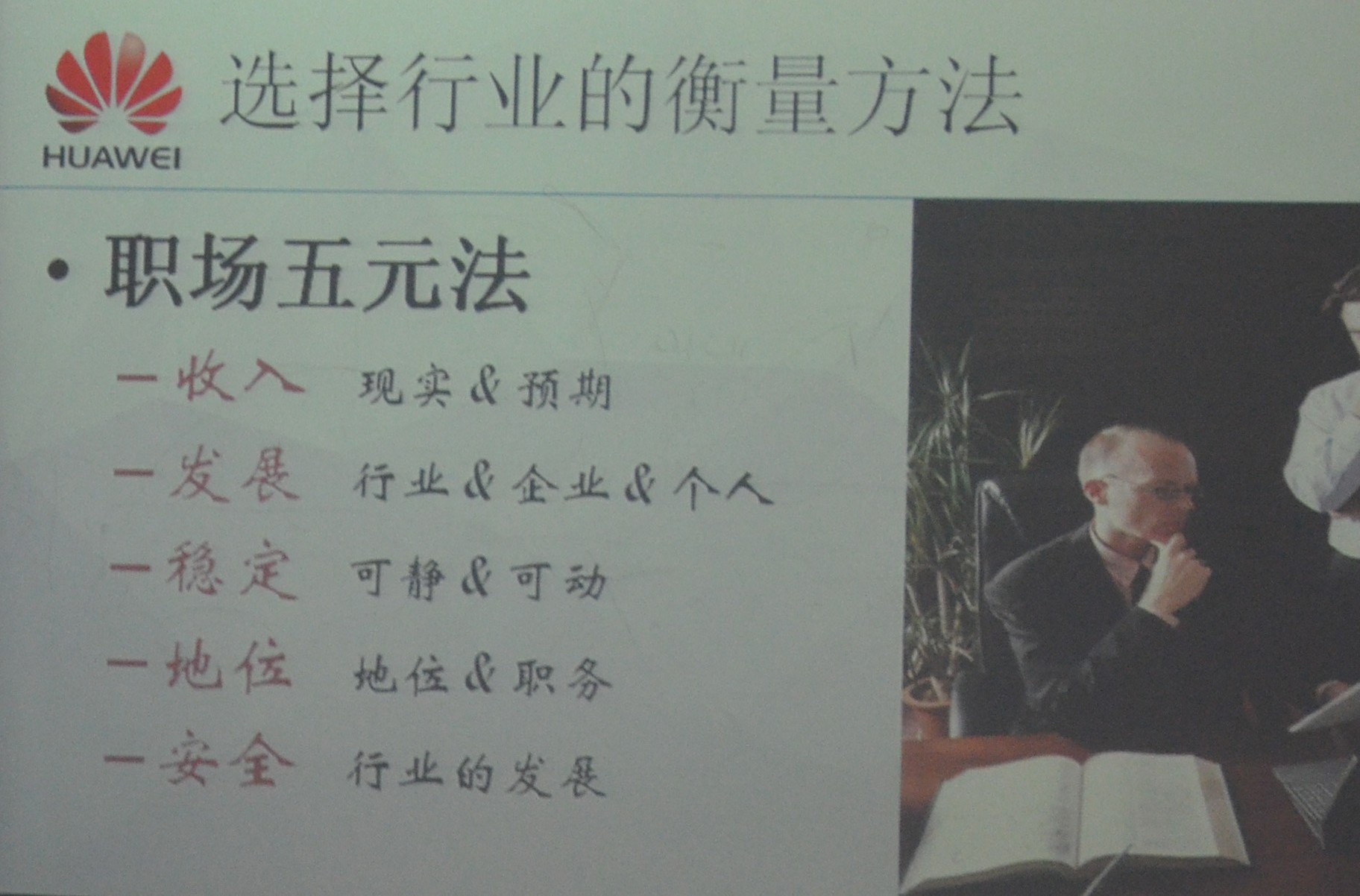 就职业方面而言,肖伟老师给出了职场五元法,“收入、发展、稳定、地位、安全”。