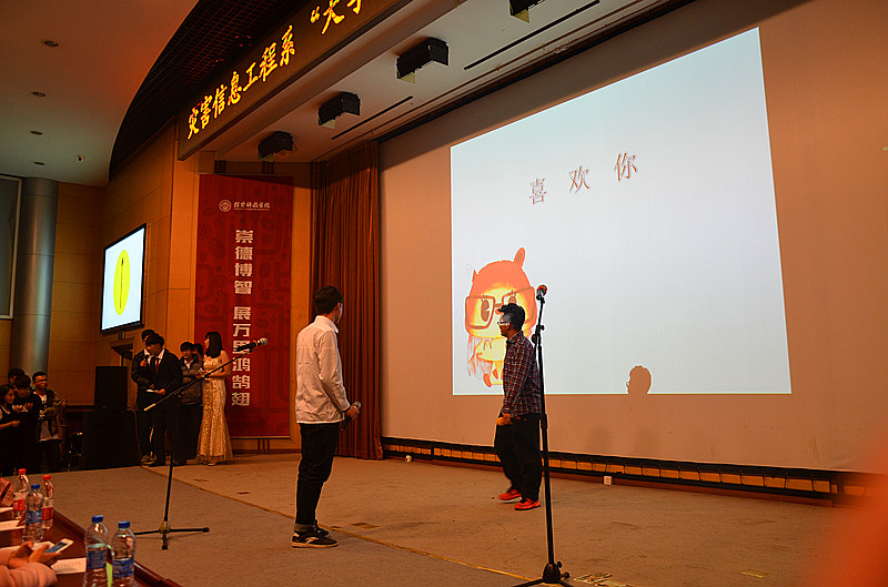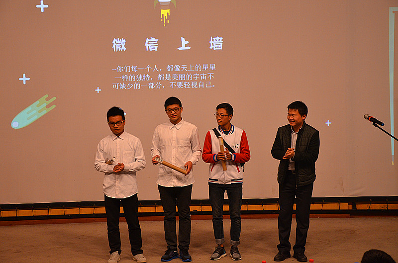 为了增强比赛的娱乐性,还为我们准备了微信上墙与小游戏环节。同学们都表现十分积极,在微信上墙和小游戏你哼我猜中分别选出了六名幸运观众和两名最佳搭档,由欧阳群波老师为他们颁发了奖品。