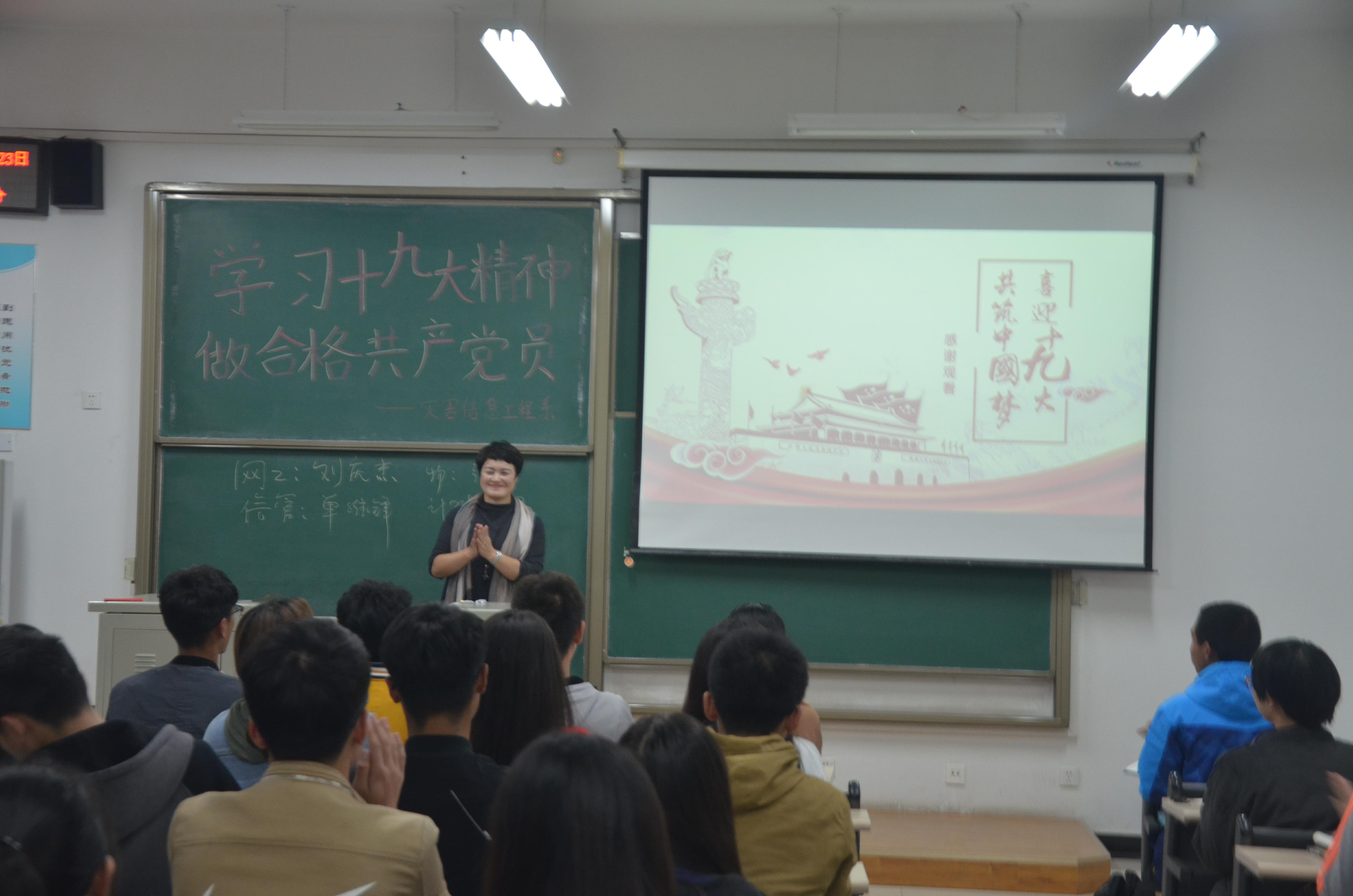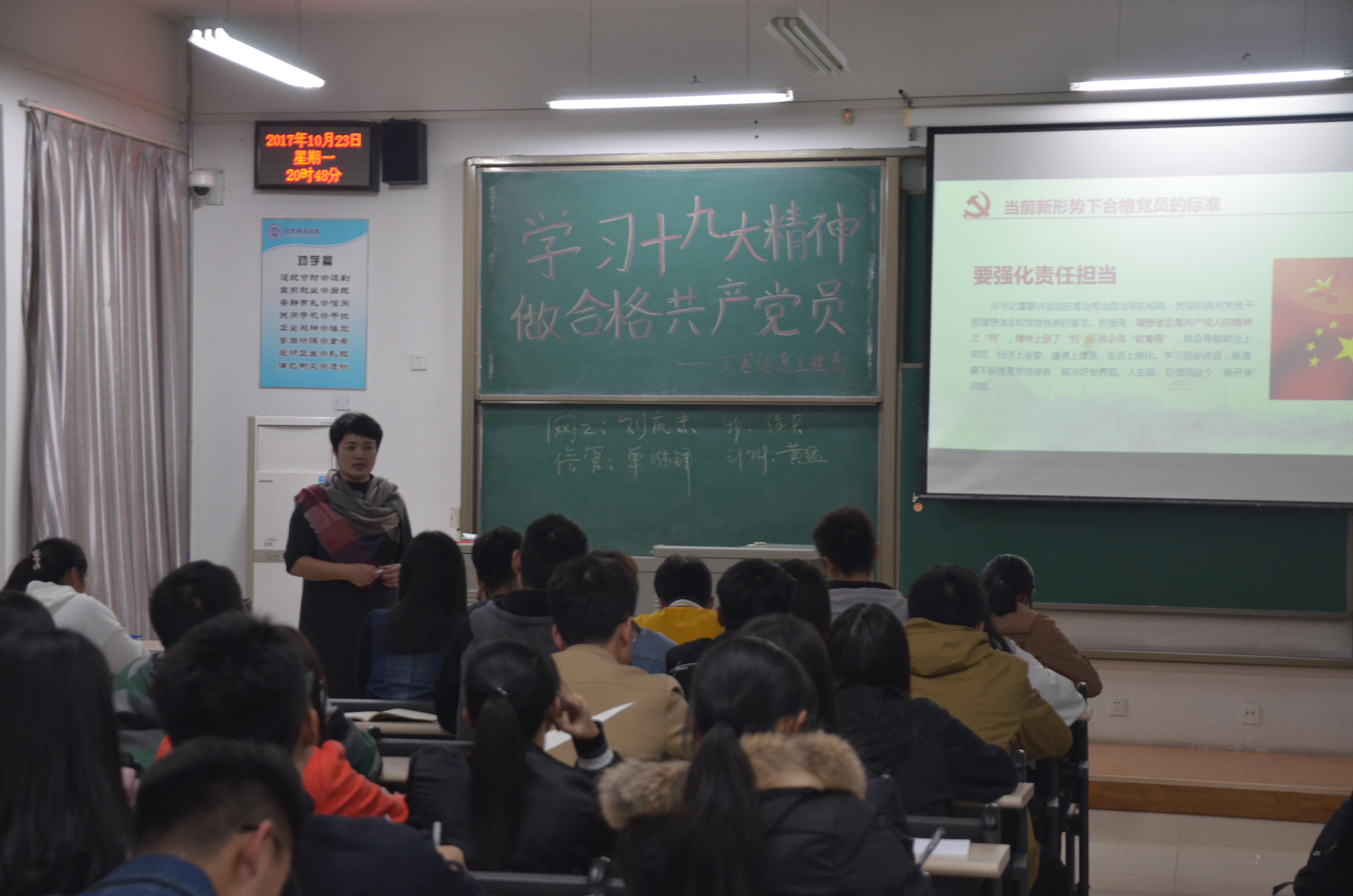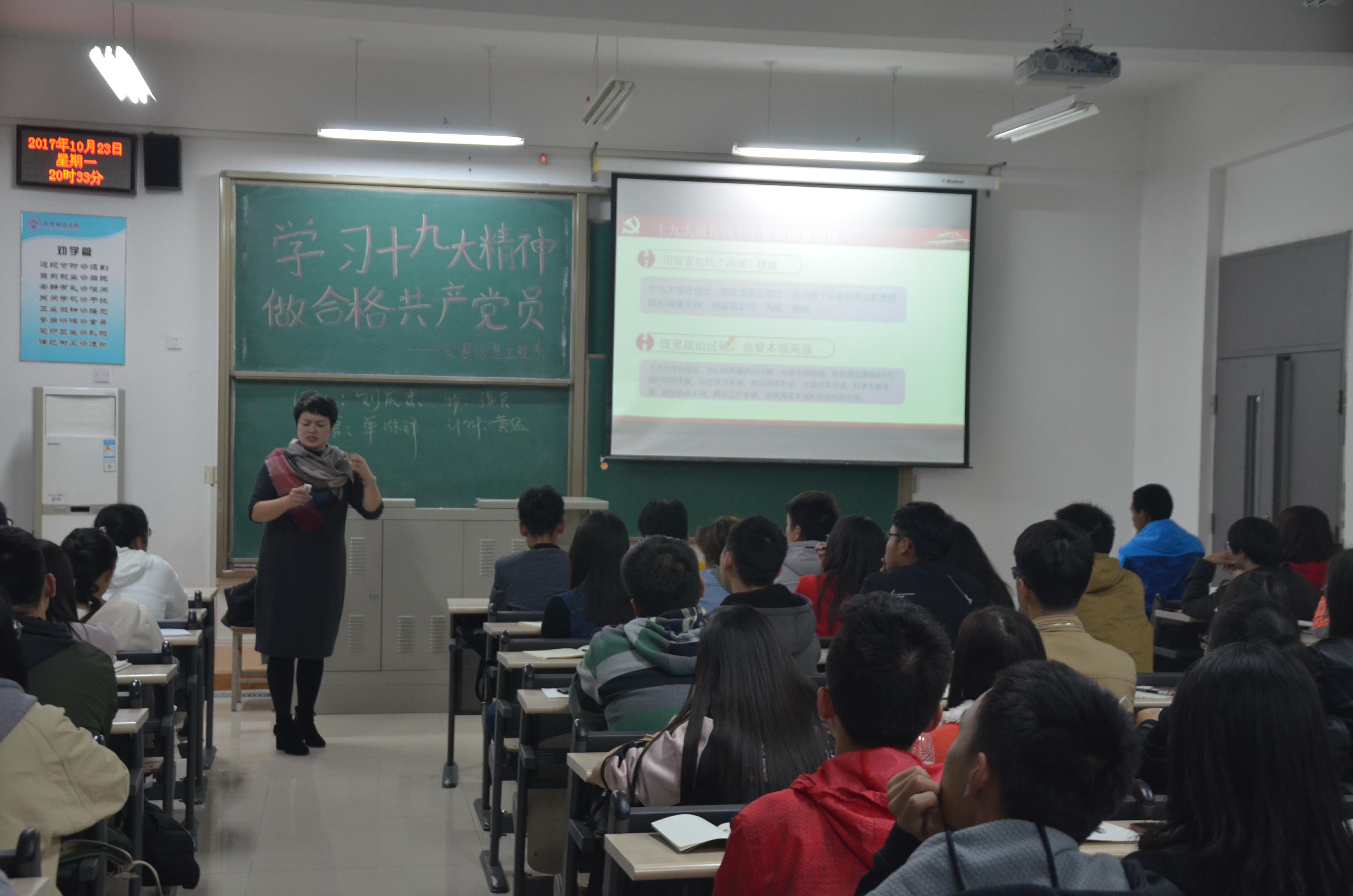 年10月23日晚,在中国共产党第十九次全国代表大会召开期间,我系党总支书记王爱玲老师为我系参加初级党员培训的员工在北校区长庚楼311教室上了一堂富有深刻意义的党课。本次课分为党的十九大简介、党的十九大报告内容、做合格党员的三个标准、新形势下合格党员的标准、如何才能成为一名合格的共产党员,喜迎党的十九大,做合格党员五部分内容。