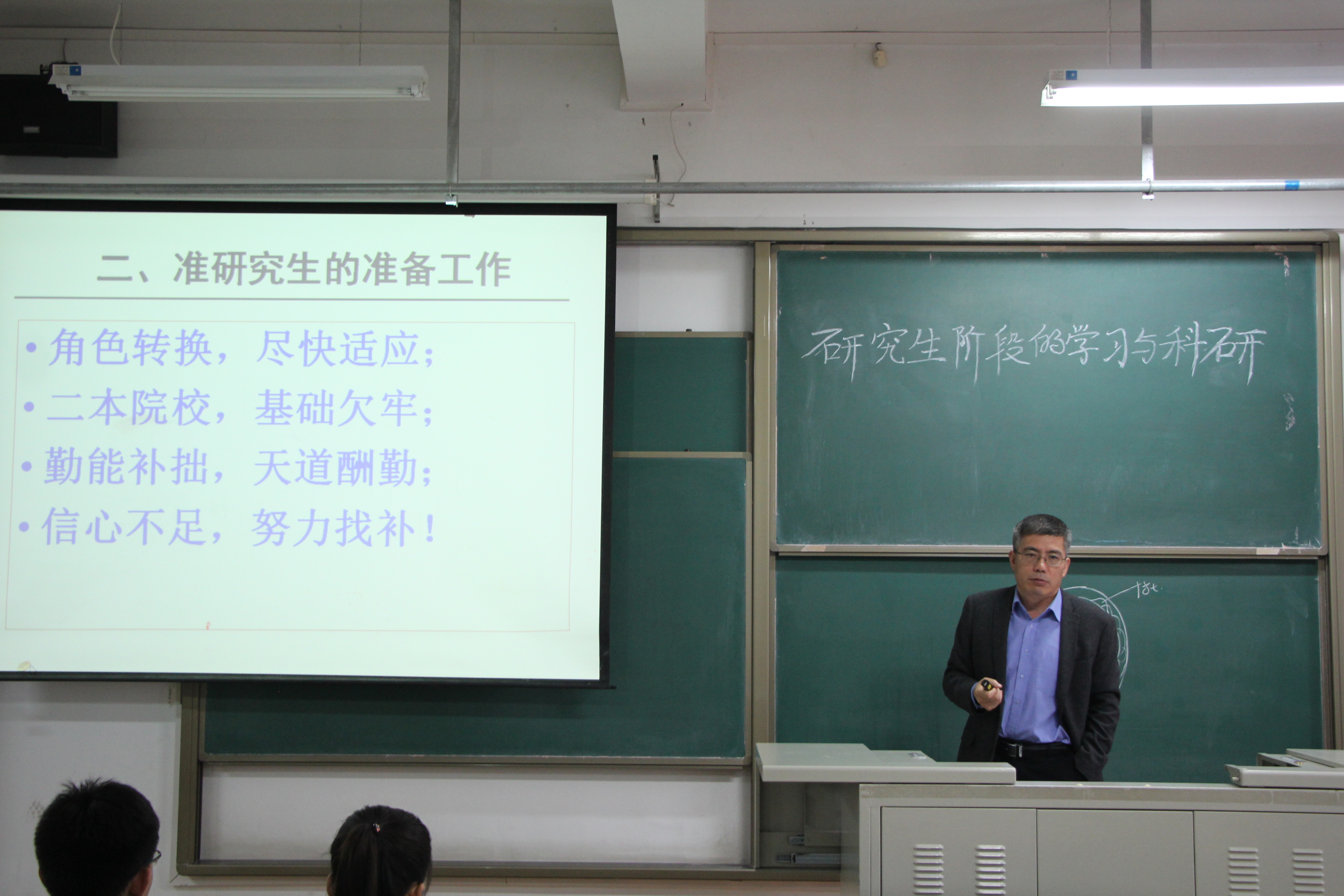 为帮助大三员工进行考研准备工作,大四员工更好的进入“准研究生”的学习状态,4月22日上午,灾害信息工程系李忠教授于北校区长庚楼318教室向我系学子开展了“研究生阶段的学习与科研”讲座。