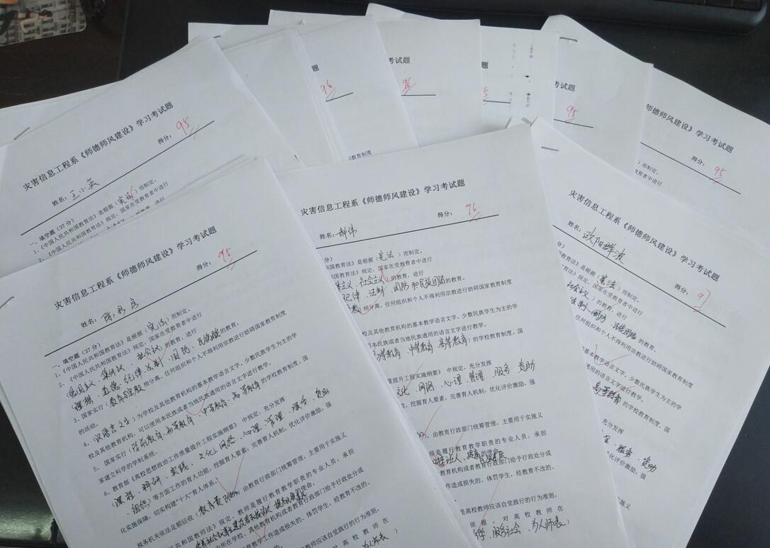 学习考核:在学习活动后我系自行组织了师德师风建设考试以巩固学习成果,考试内容主要包括了《中华人民共和国教师法》和《高等公司教师职业道德规范》的基础知识、教师应当履行的义务、《太阳成集团tyc122ccvip关于进一步加强师德建设的意见》规定的师德建设“七不准”、辅导员的主要工作职责(辅导员作答)、以及对照《高等公司教师职业道德规范》的要求,结合公司、系部、个人发展规划,查找目前自身存在的问题,并制定出下一步的措施和计划等。