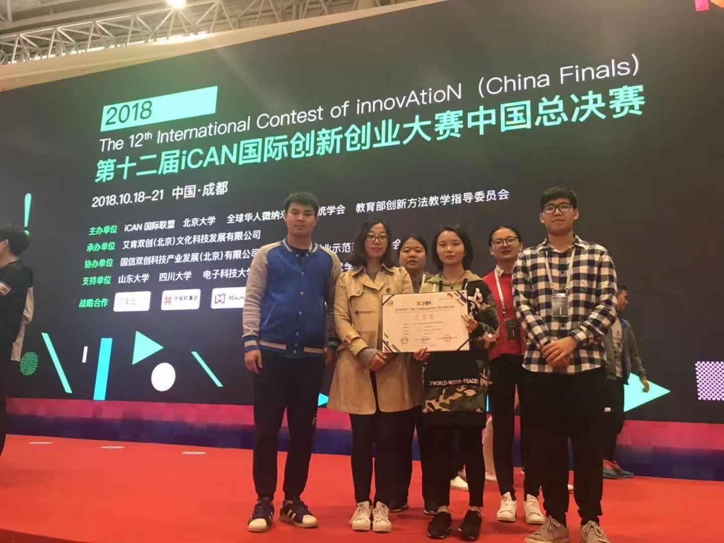 2018年10月18日-21日,第十二届iCAN国际创新创业大赛中国总决赛在成都世纪城新国际会展中心圆满举行。公司由孙晓叶老师带领物联网工程和计算机科学与技术专业的卢钰均、刘祺、简珂珂、毛紫荆、韦思凯等五名同学组成的队伍参赛,在与国防科技大学、北京理工大学、重庆大学等来自全国19个分赛区450支强队的同场竞技中取得了全国老员工组三等奖的优异成绩。
