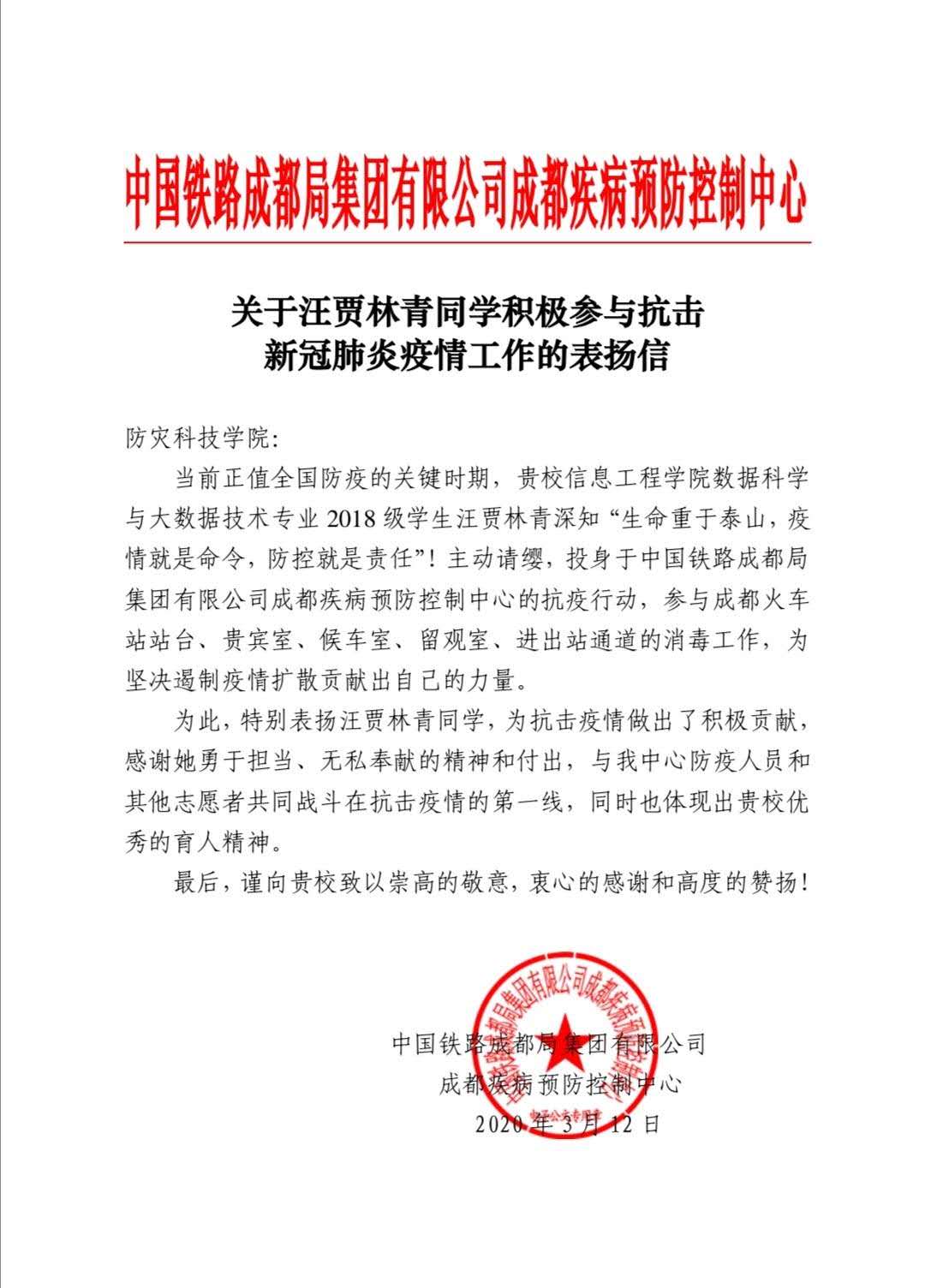 关于公司汪贾林青同学积极参与抗击新冠疫情防疫工作的表扬信