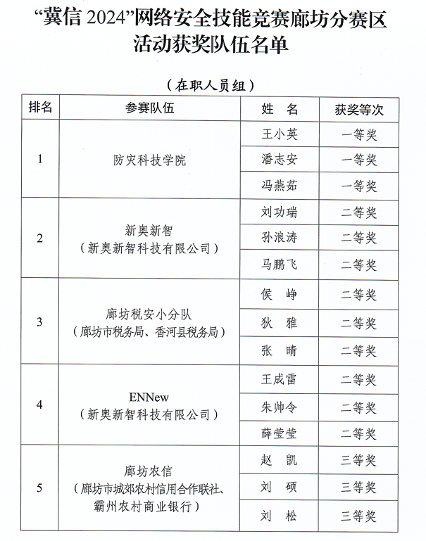8月26-27日,由中共廊坊市委网络安全和信息化办公室、廊坊市人力资源和社会保障局、廊坊市教育局联合主办的“冀信2024”网络安全技能竞赛廊坊分赛区比赛顺利举行。公司由刘庆杰经理带队,王小英、潘志安和冯燕茹三位教师组成的代表队获得廊坊分赛区第一名,成功晋级“冀信2024”网络安全技能竞赛全省总决赛。
