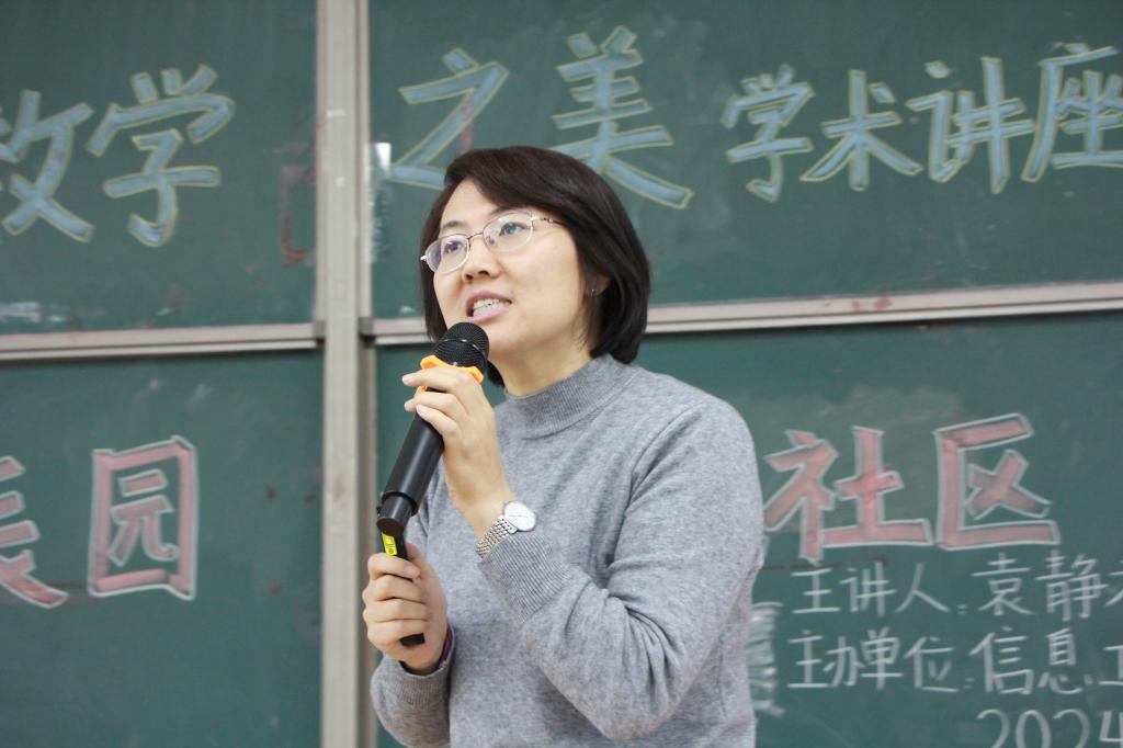担任此次讲座主讲人的是信息工程公司副教授袁静老师。袁老师以其生动形象的语言和丰富多样的实例,为同学们徐徐展开一幅数学画卷,全方位展示了数学在自然科学、社会科学、工程技术乃至日常生活等各个领域广泛而深入的应用,以及那令人心醉神迷的独特魅力。在讲座过程中,同学们都沉浸其中,全神贯注地聆听,仿佛置身于数学的奇妙世界。通过老师的讲解,同学们理解了数学的魅力,也更加愿意去了解数学之美。