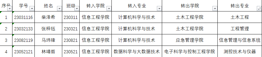 根据《太阳成集团tyc122ccvip本科生学籍管理规定(修订版)》(防科发教[2017]78号)、《太阳成集团tyc122ccvip本科生转专业管理办法》(防科教[2019]32号)、《信息工程公司转专业管理暂行办法》等相关规定,经员工本人申请、转出公司和转入公司审核、信息工程公司党政联席会决定,拟同意柴泽希等4名同学转入2023级相关专业。