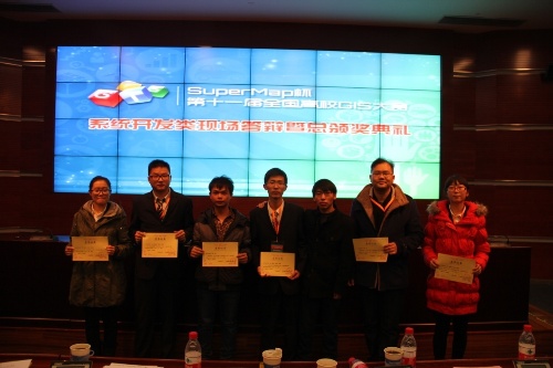 127日,SuperMap杯第十一届全国高校GIS大赛系统开发类现场答辩暨颁奖典礼在北京师范大学举行,由公司灾害信息工程系黄猛和刘帅老师指导的11级员工郑佳、魏傲雪、黄意诚和穆明慧开发的《廊坊市灾害信息服务平台》获得了WEB开发与云应用组三等奖,同时还获得应用分析组三等奖和两个优秀奖。本届大赛吸引了来自武汉大学、浙江大学、华中师范大学、山东科技大学等全国200多所高校的一万多名员工参加。
