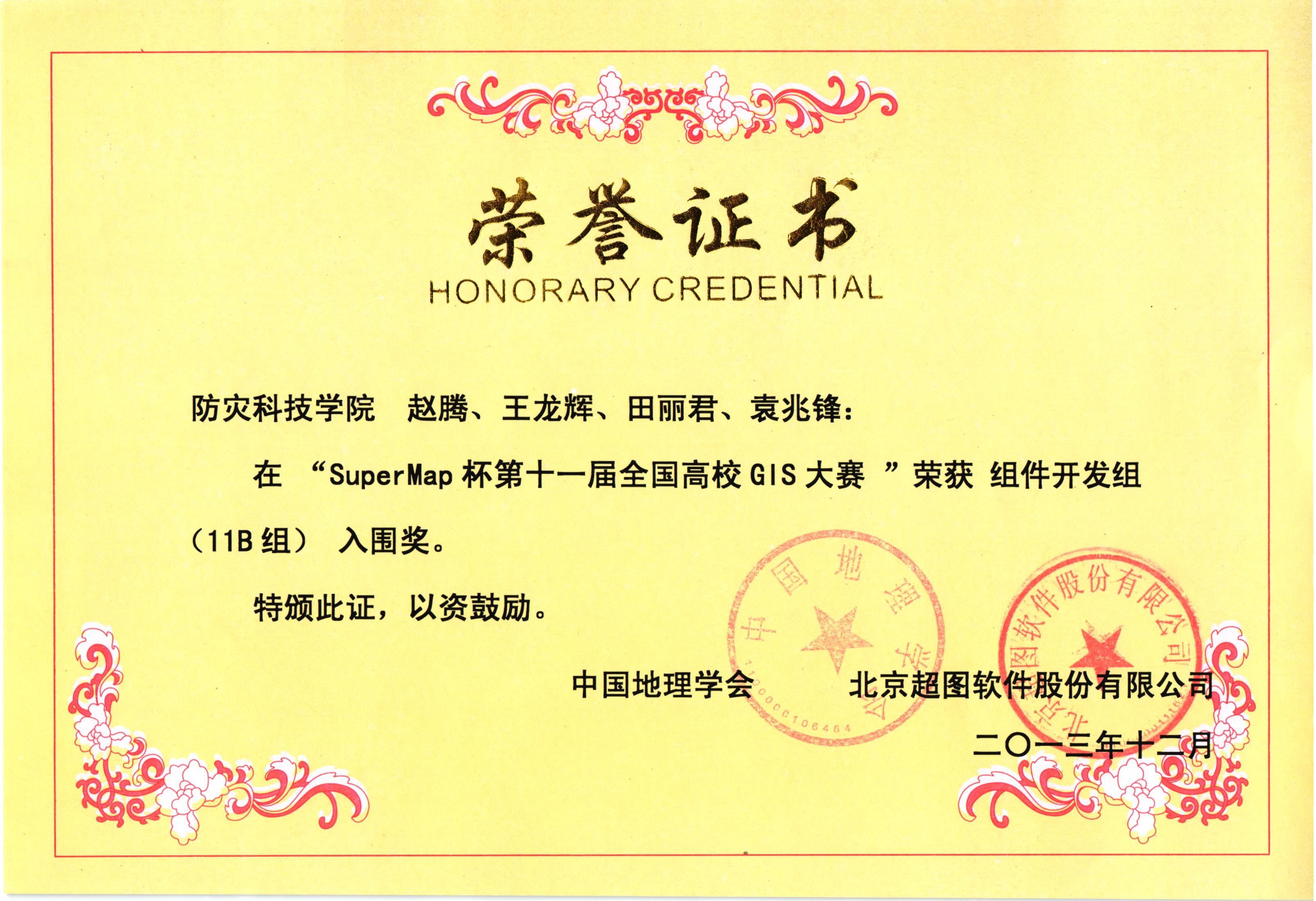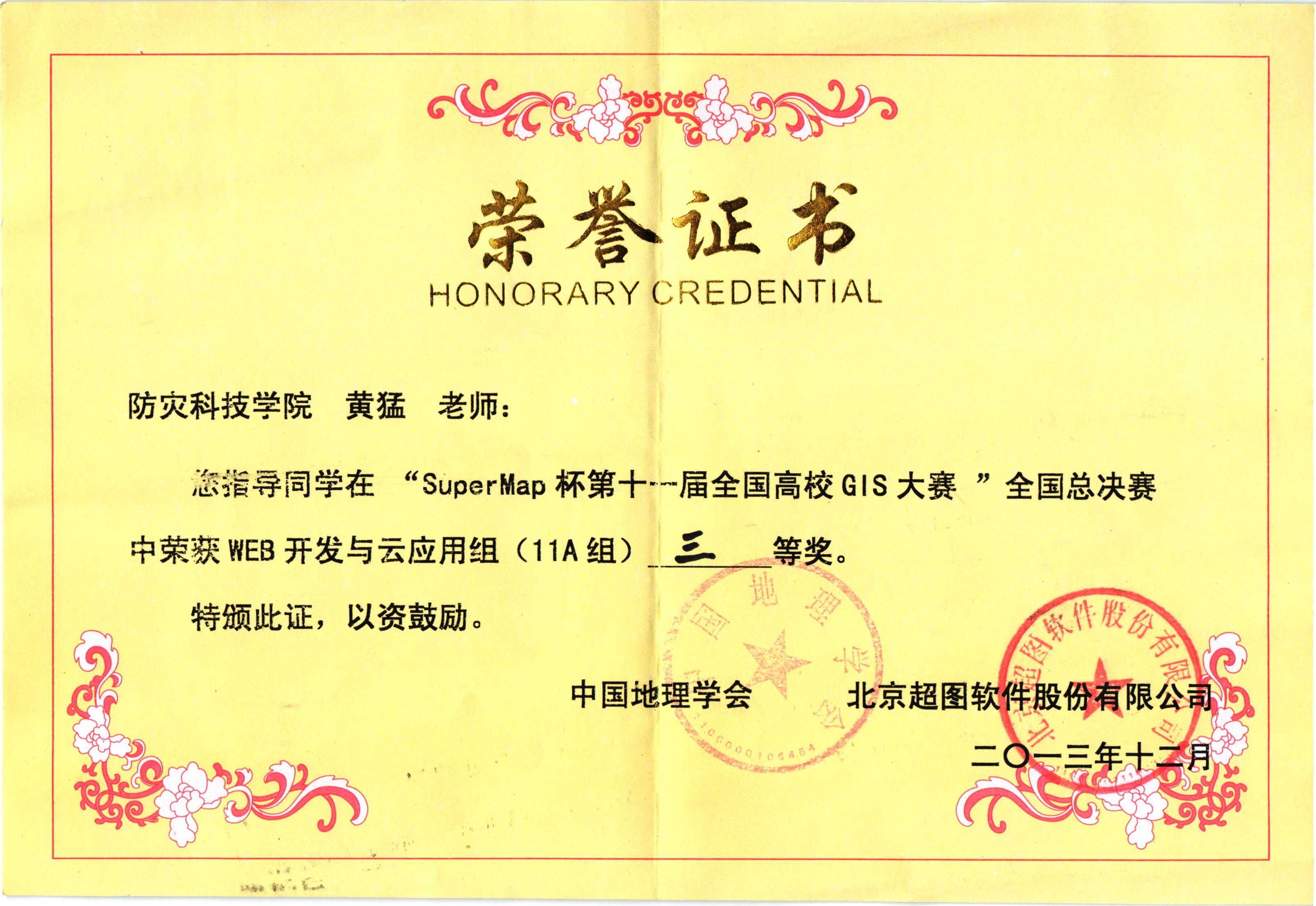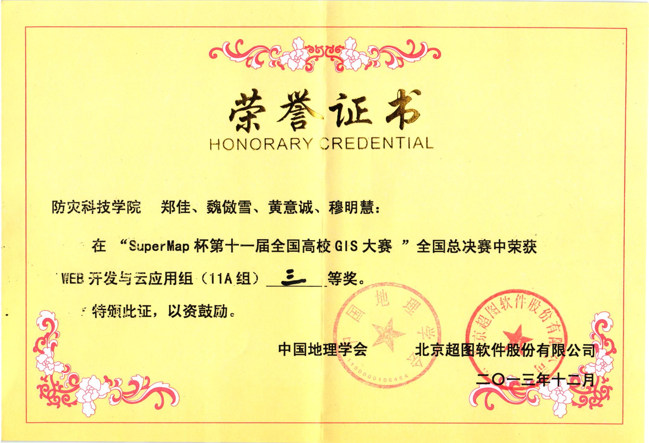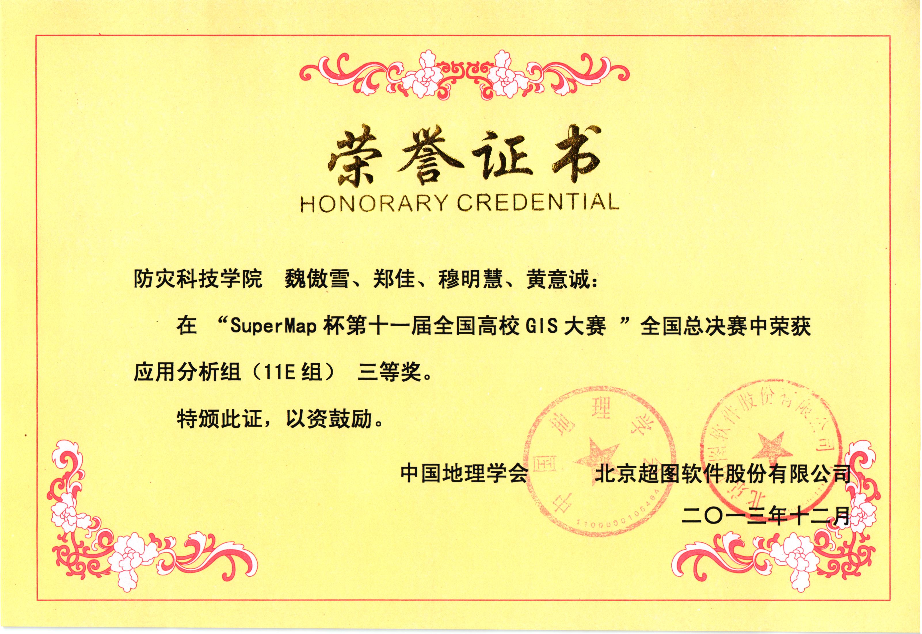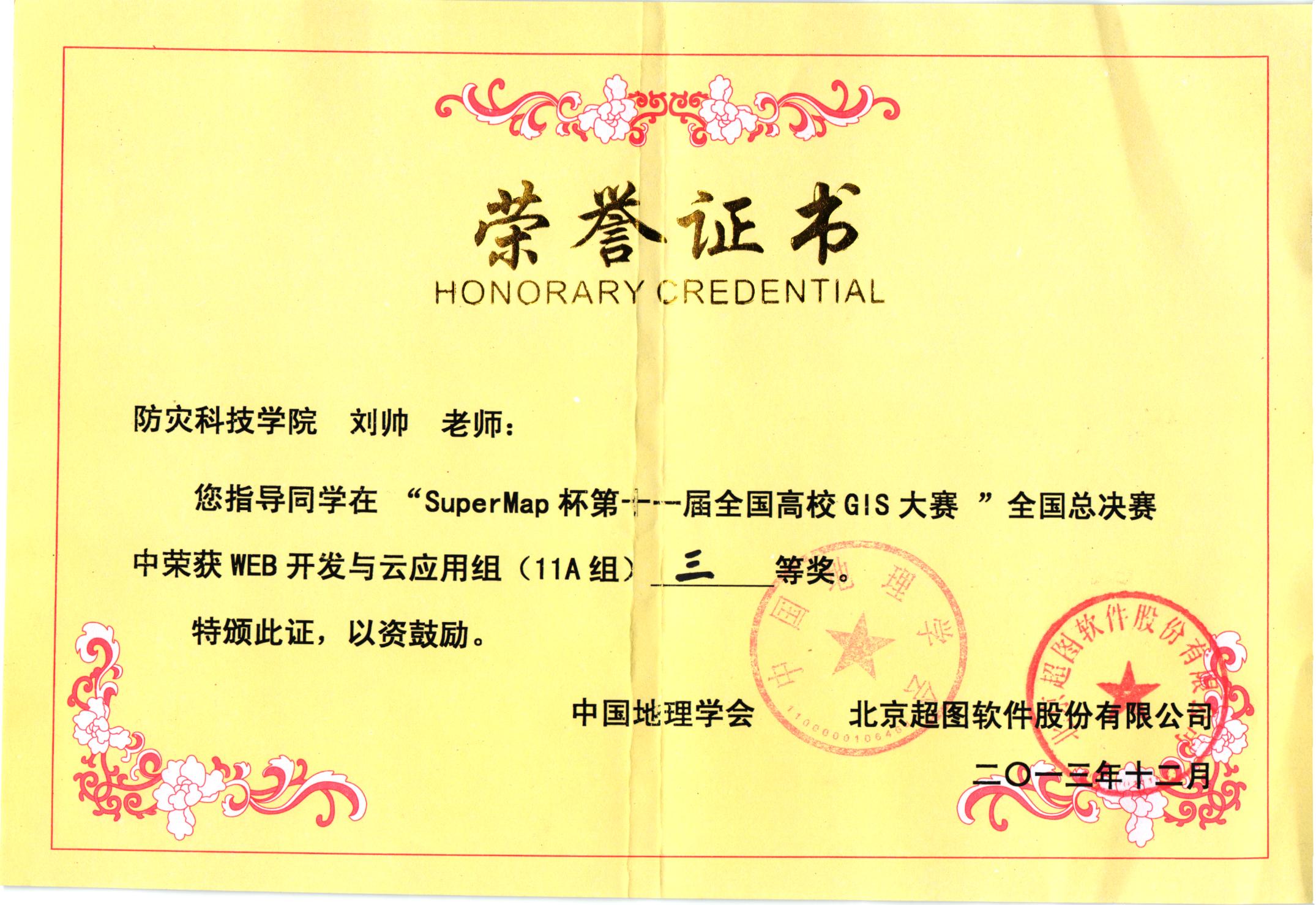 2013年SuperMap杯第十一届全国高校GIS大赛获奖证书