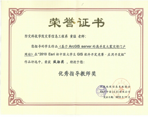 2010年Esri杯中国老员工GIS软件开发竞赛获奖证书