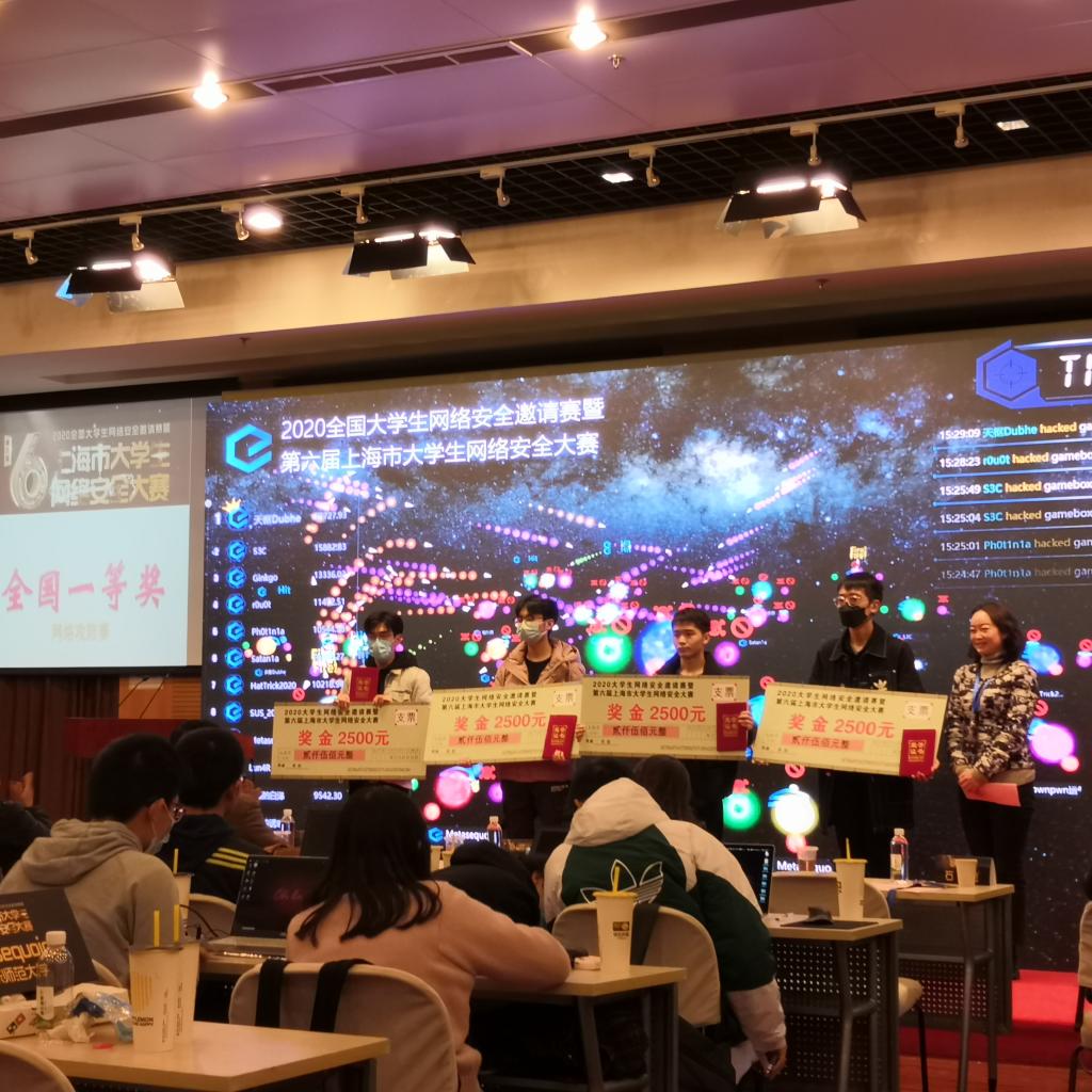 12月19日,2020年全国老员工网络安全大赛暨第六届上海市老员工网络安全大赛在东华大学举行,公司信息安全实验室Ginkgo战队(刘轩成、魏江水)经过线下六个小时的角逐,取得了第三名的优异成绩,荣获全国一等奖。在此次大赛信息安全作品赛中Ginkgo战队(刘翰卓、魏江水、刘轩成、郭邦照、王可)荣获全国三等奖。