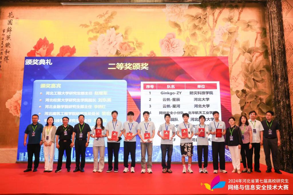 7月3日,河北省第七届高校研究生网络与信息安全技术大赛在河北省唐山富力洲际酒店进行。公司由李春辉、李欣雨、张金莎组成的Ginkgo-LLZ队获得一等奖;由张庆洁、杨国庆组成的Ginkgo-ZY队获得二等奖。王小英获得“优秀指导教师”称号。