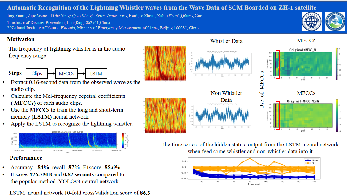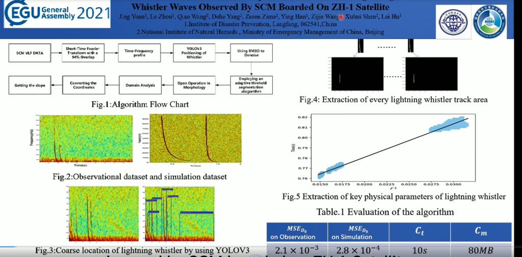 公司大三员工周乐在线汇报了其研究工作《Automatic Extraction of the Dispersion Coefficients of Lightning Whistler Waves Observed By SCM Boarded On ZH-1 Satellite》;王子杰同学在线汇报了其研究工作《Automatic Recognition the Lighting Whistler waves from the Wave Data of SCM Boarded on ZH-1 satellite》,该工作引起了SWARM卫星团队的关注,受到了业界的好评。指导老师分别是公司的袁静老师和韩莹老师以及国家自然灾害防治研究院的申旭辉、泽仁志玛、王桥和杨德贺老师等。