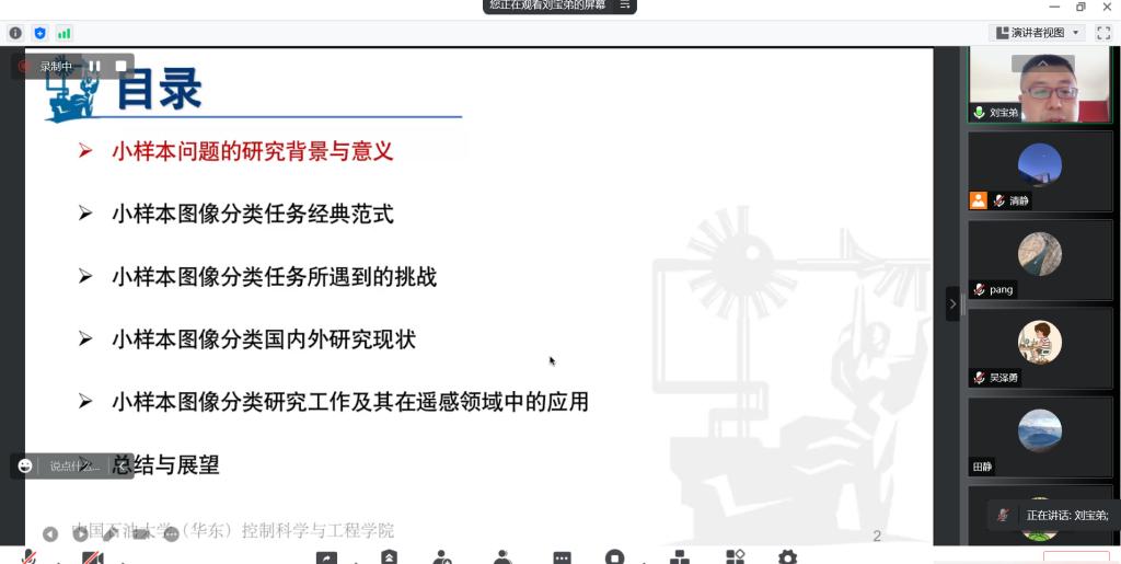 刘宝弟博士从小样本问题的研究背景与意义、小样本图像分类任务的经典范式、小样本任务遇到的挑战、小样本分类国内外研究现状,并结合团队在遥感领域的研究成果进行了全面的介绍。他带领团队从基于多视角融合、基于字典学习、基于部件监督、基于类无关映射、基于傅里叶图像增强等方面对传统的小样本分类进行了改进并成功应用于遥感领域;此外,刘宝弟博士从自身的经历出发介绍了学术论文的选题、撰写和发表方面的宝贵经验。与会人员围绕遥感的小样本分类的数学建模等技术细节进行讨论,并围绕学术论文的撰写等方面进行了深入探讨。