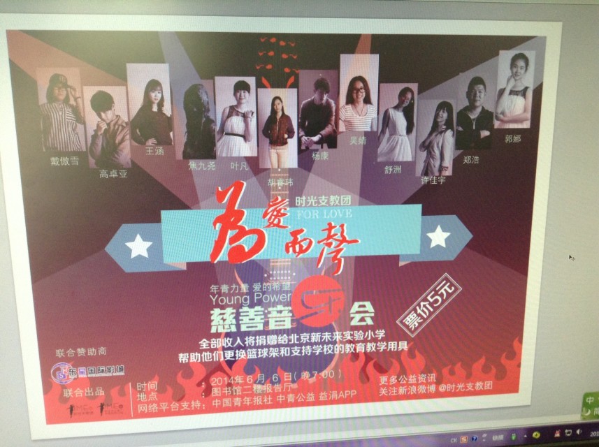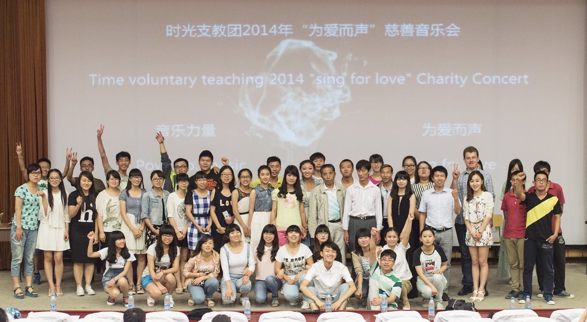 2014年6月6日,时光支教团在图书馆报告厅举办了“为爱而声”慈善音乐会,时光支教团指导教师赵会朋,新未来实验公司孙董事长和支教团外语指导教师Mr.seamus出席音乐会。音乐会由支教团团长杨康同学主持。