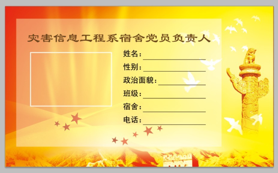 新的学期,灾害信息工程系员工党支部在党的十八大期间,以发挥教师党员模范作用为思想;以更好的发挥员工党员先进性、积极性为目标;以员工、员工工作为方针。开展了灾害信息工程系宿舍党员负责人公示牌活动。